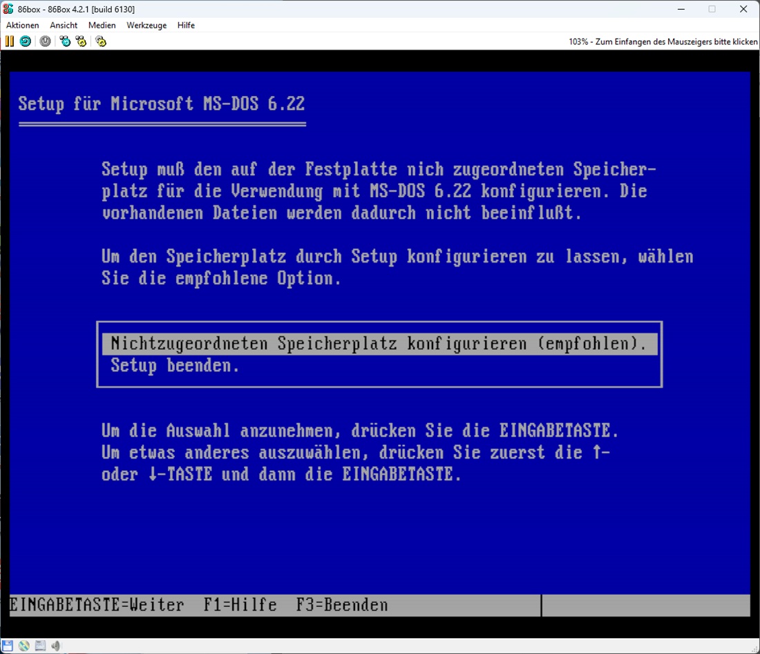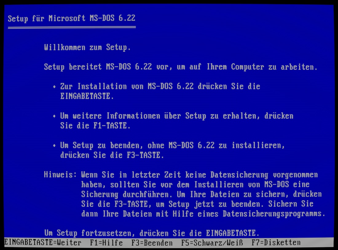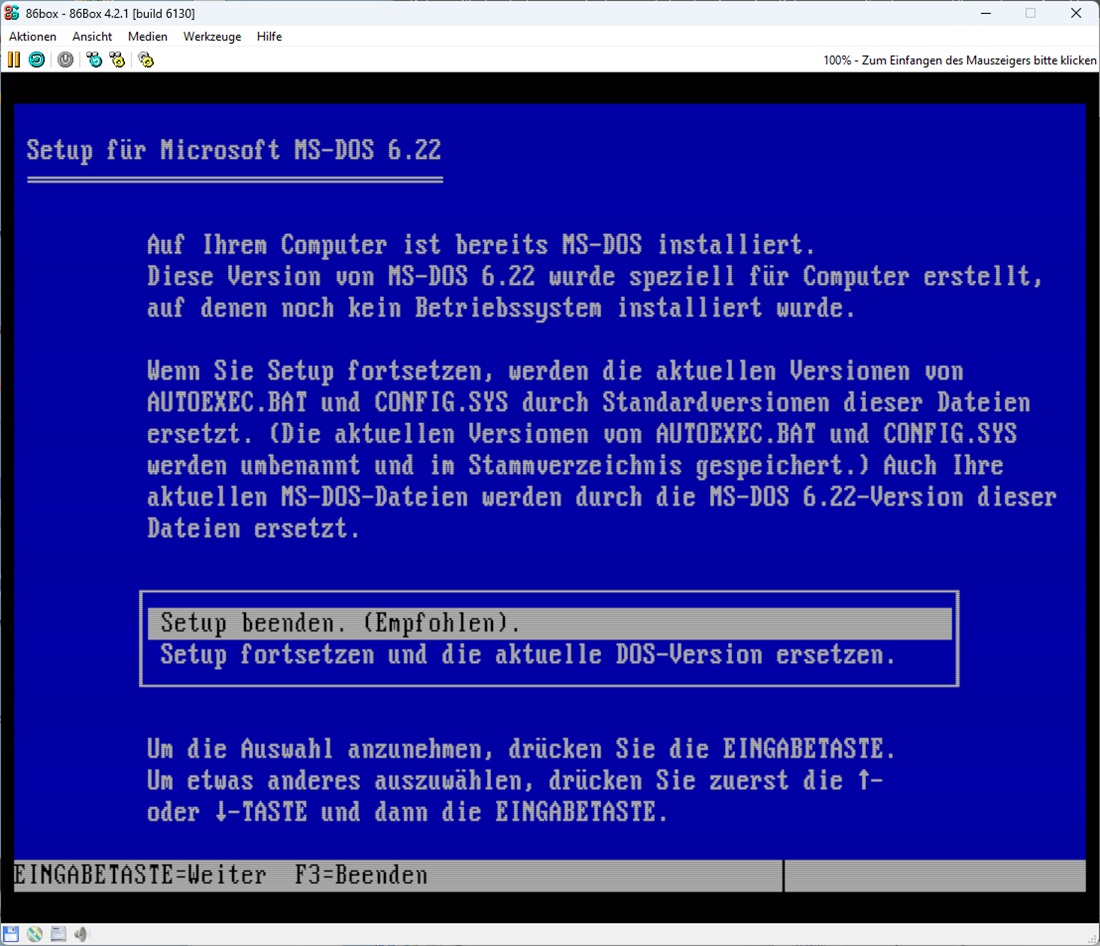 Damit sind wir fertig und können zum MS-DOS-Setup zurückkehren. Gib dazu einfach „setup“ an der Eingabeaufforderung ein.