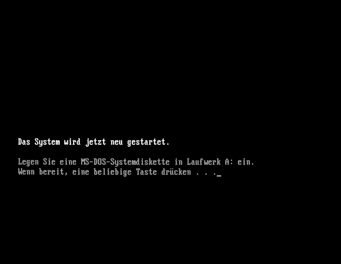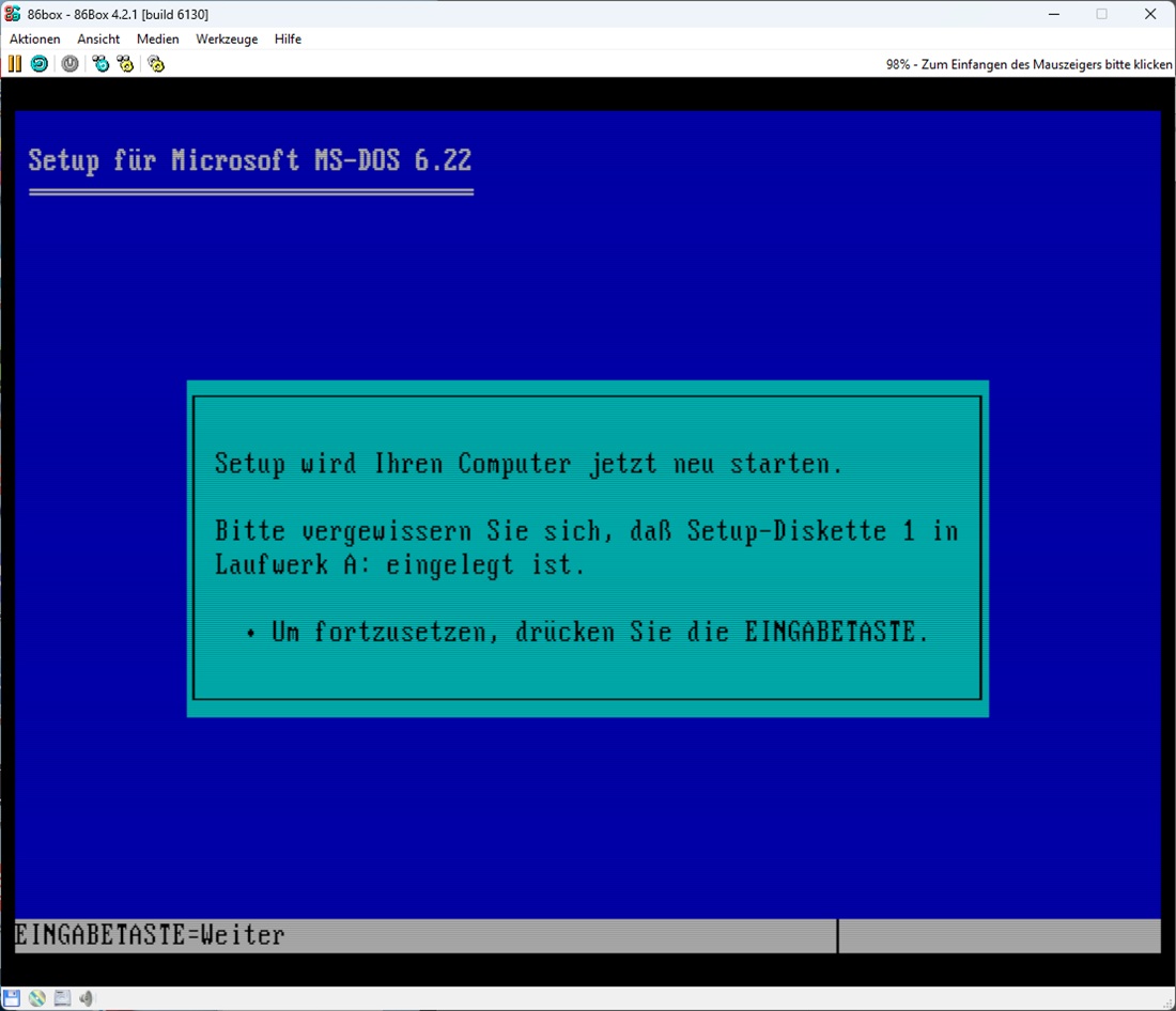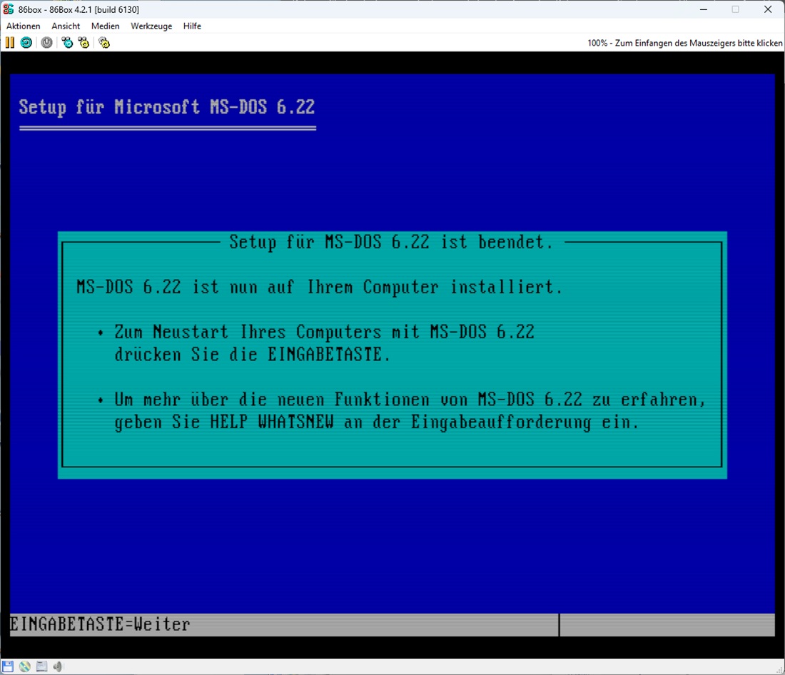 Glückwunsch, nun ist MS-DOS 6.22 auf der Festplatte installiert! Mit der Eingabetaste bestätigst du den Neustart.