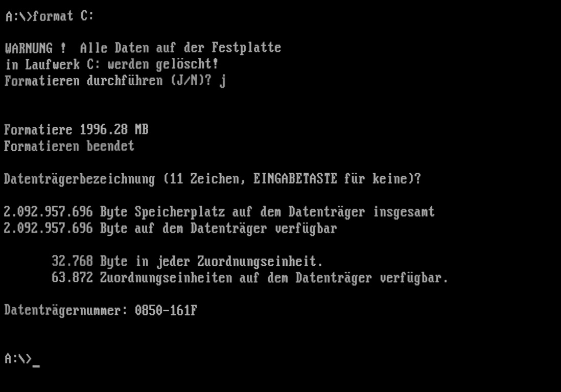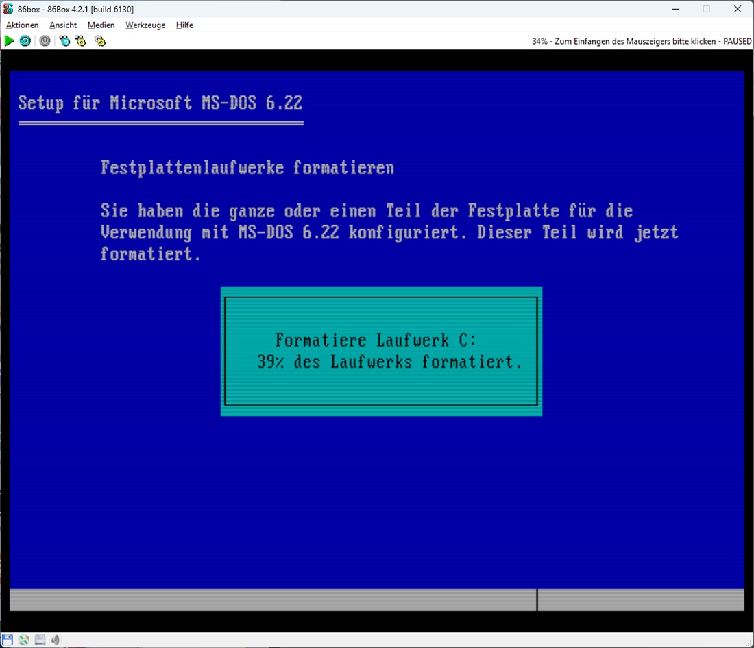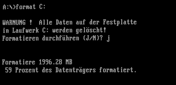 Jetzt wird die Festplatte C: formatiert. Auf einem originalen DOS-Rechner war dieser Prozess sehr langwierig und erforderte Geduld – oft dauerte es bis zu einer Stunde, bis er fertig war.