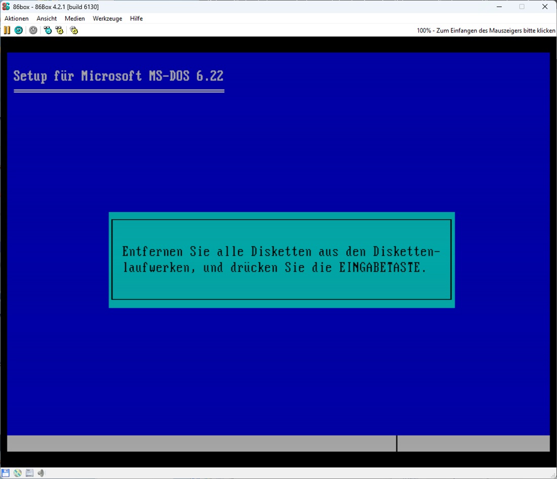 Sobald der gesamte Installationsvorgang fertig ist, fordert das Setup dich auf, die Disketten aus allen Diskettenlaufwerken zu entfernen. Bestätige danach mit der Eingabetaste.