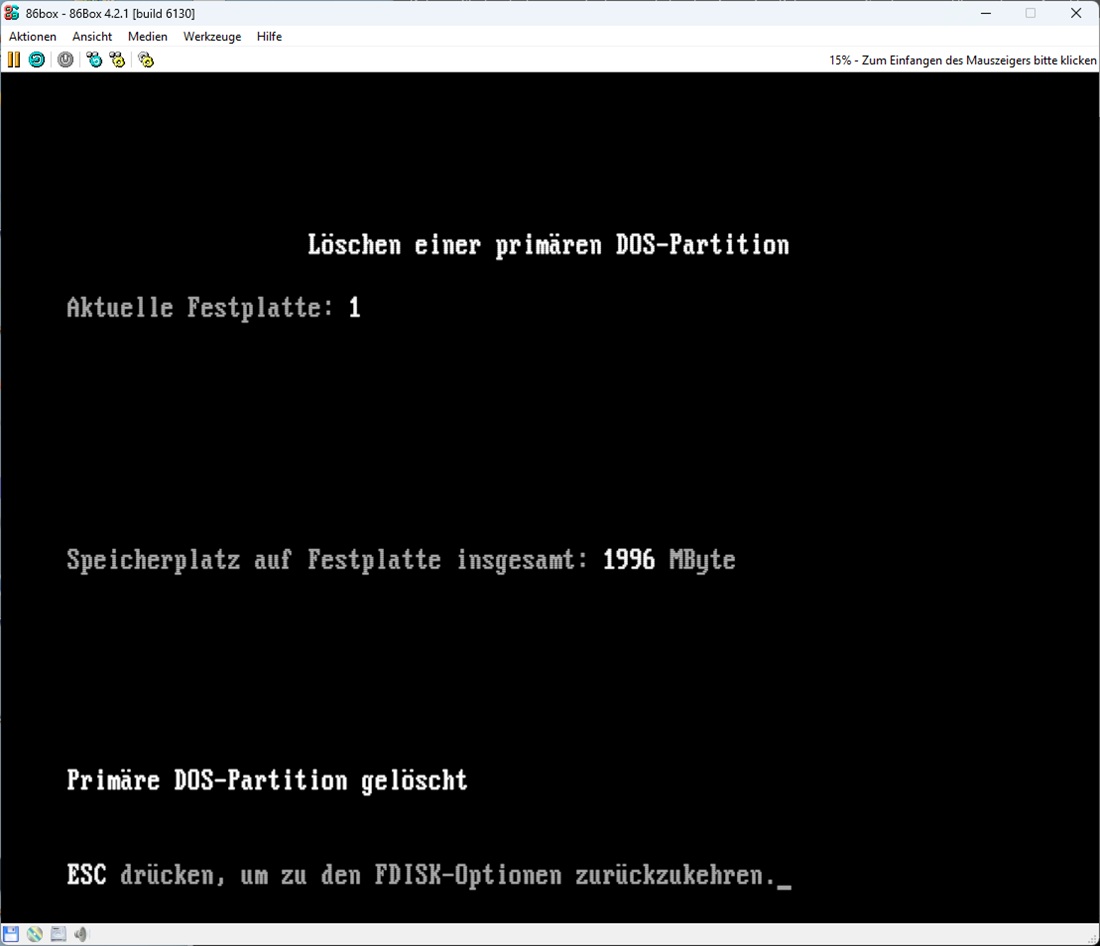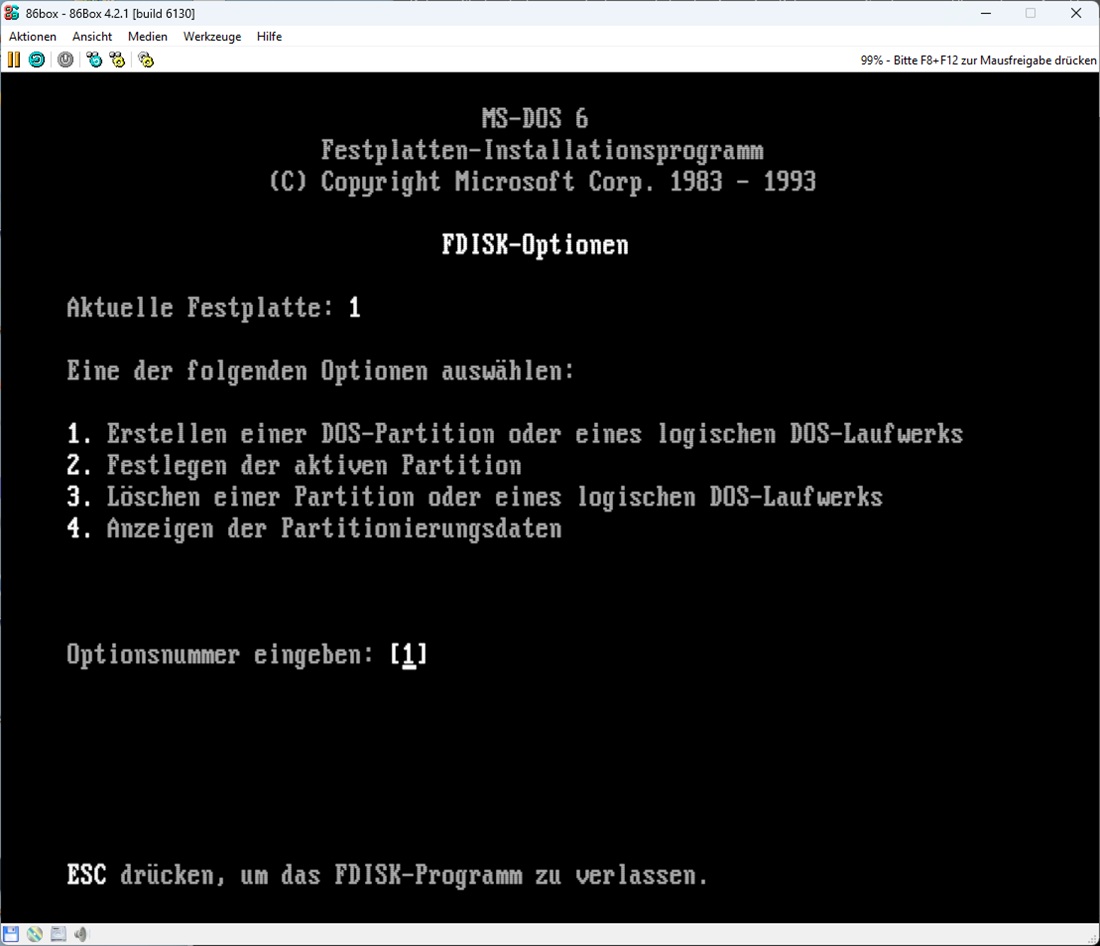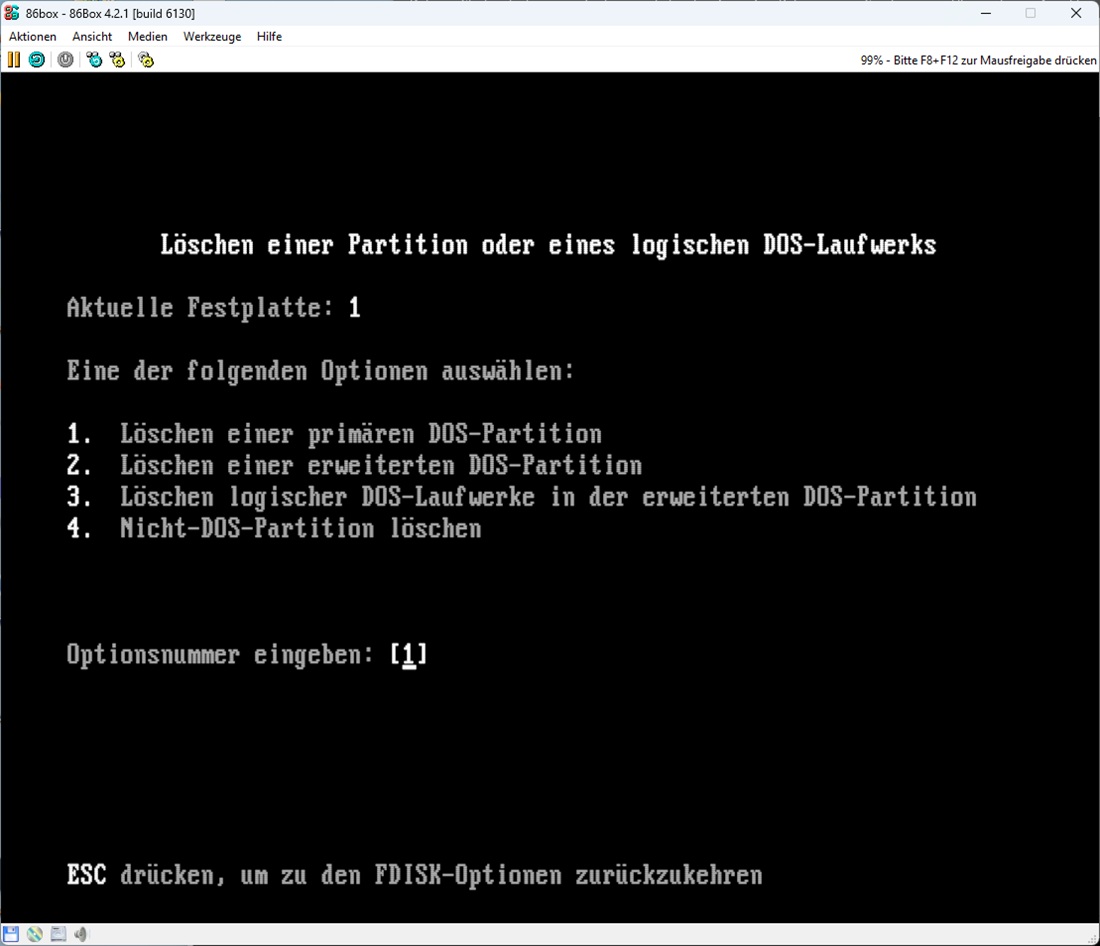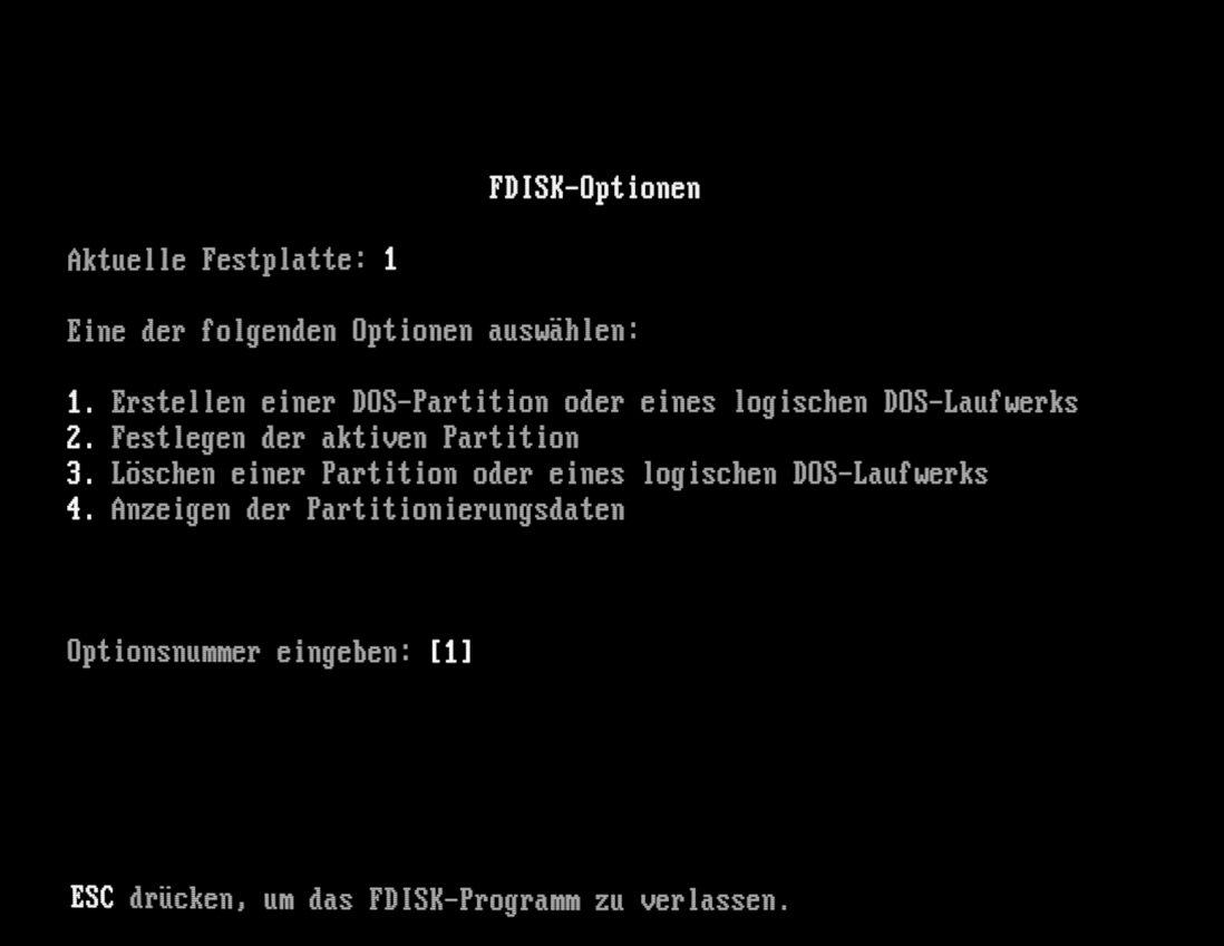 Jetzt, da sie gelöscht ist, kehren wir zum Hauptmenü zurück (drücke ESC), um sofort eine neue Partition zu erstellen. Wähle die Nummer 1 („DOS-Partition oder Logisches DOS-Laufwerk erstellen“).