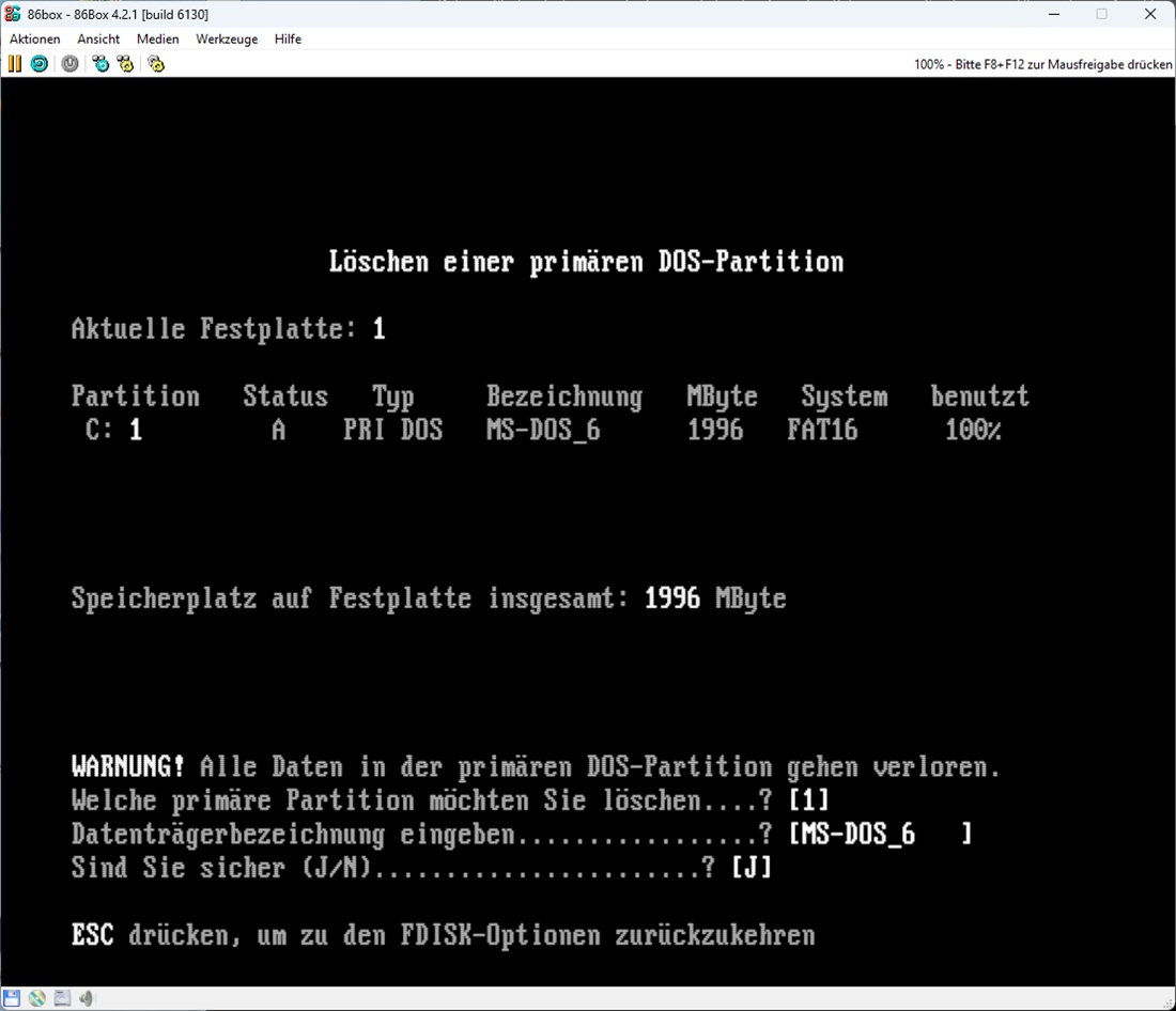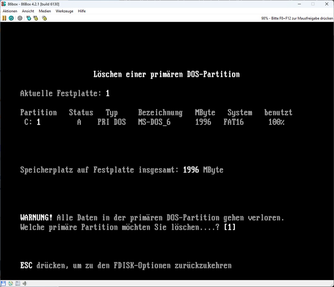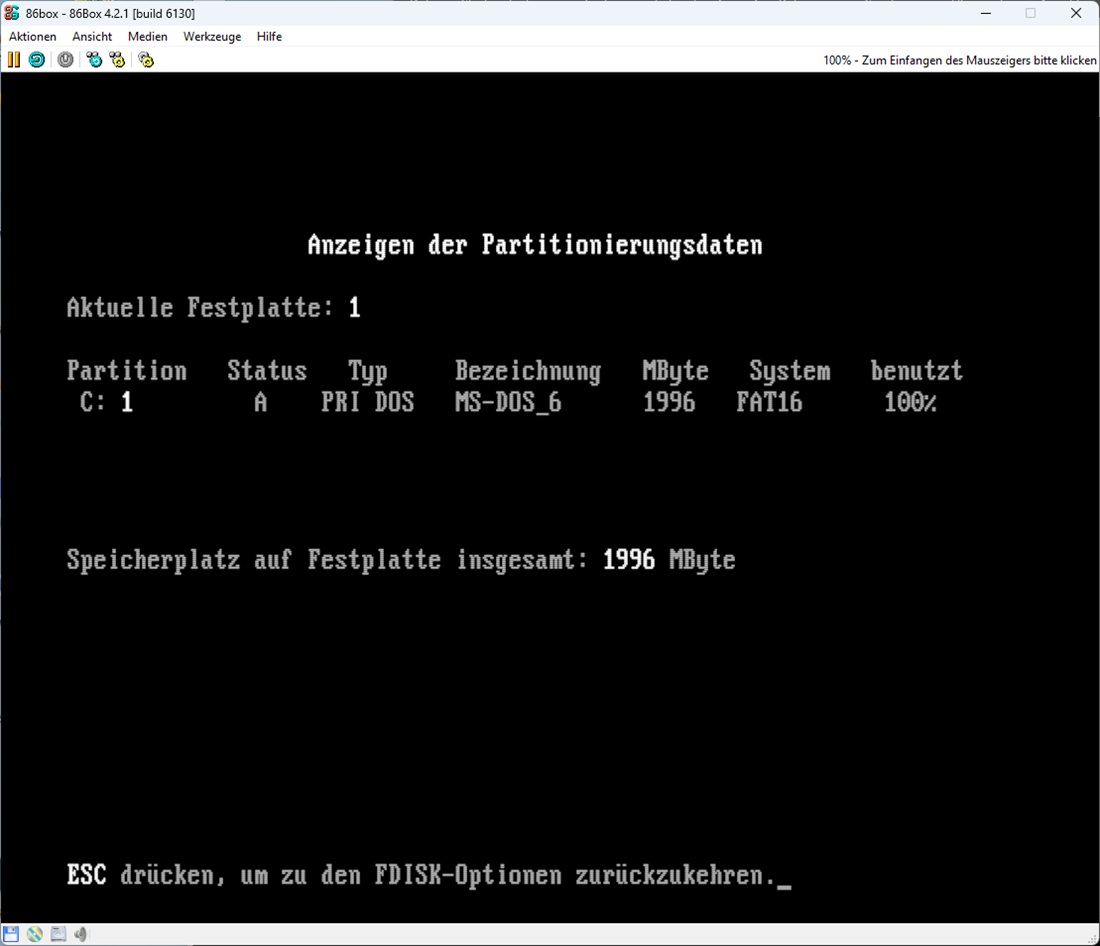 Die Standardeinstellung kannst du so mit der Eingabetaste bestätigen. Der nicht zugeordnete Speicherplatz wird automatisch konfiguriert und zu 100% genutzt, es sei denn, die Festplatte ist größer als 2 GB. Wenn die Festplatte größer als 2 GB ist, wird die Partition trotzdem nur 2 GB groß. Das liegt daran, dass das Dateisystem (FAT16) eine maximale Beschränkung von 2 GB pro Partition hat, da es ein 16-Bit-System ist. (Es gibt auch das Ur-Dateisystem FAT12, das aber nur für Disketten und Festplatten kleiner als 32 MB vorgesehen war.)