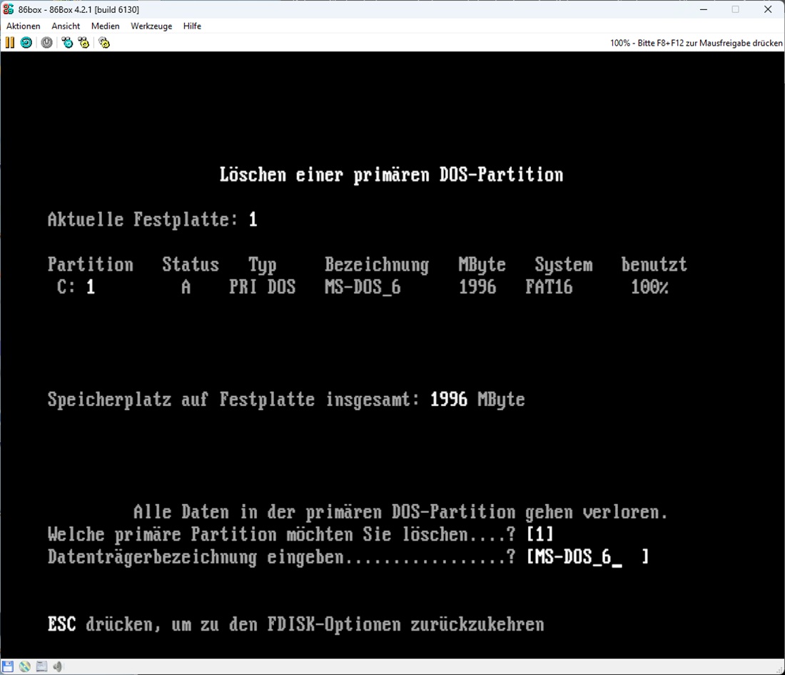 Wir wollen die Partition 1 löschen. Diese ist bereits ausgewählt, also drücke die Eingabetaste, um es zu bestätigen. Jetzt fordert dich der Partitions-Manager auf, die Datenträgerbezeichnung (Volume Label) einzugeben, um zu bestätigen, dass du sie wirklich löschen willst. Im Bild ist es „MS-DOS_6“. Tippe diese Bezeichnung exakt ab: „MS-DOS_6“