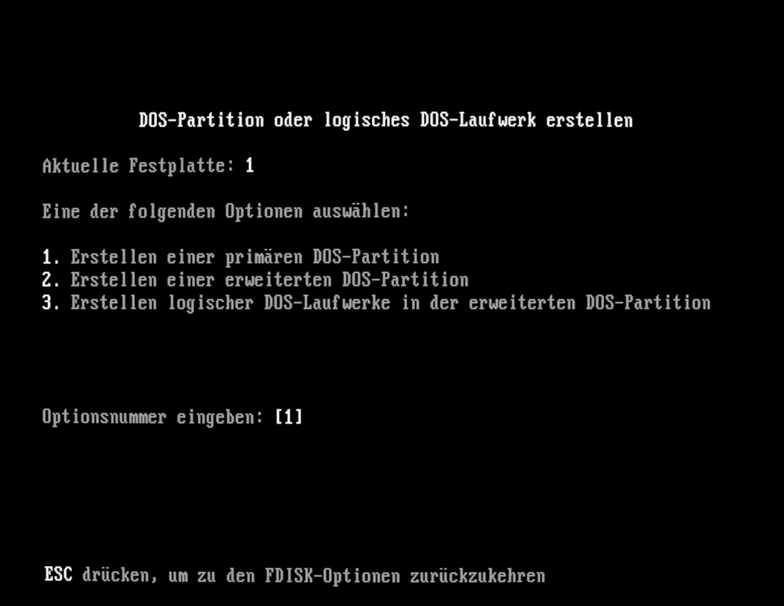 Bestätige also die Option 1 („Primäre DOS-Partition erstellen“) mit der Eingabetaste.