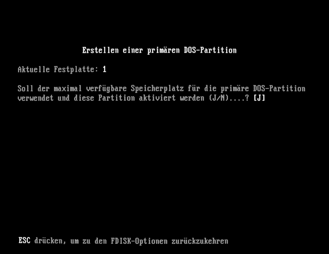 Ja, wir wollen die gesamte Festplatte nutzen und sie direkt als aktive Partition erstellen. Das hat einen historischen Kontext: Damals konnte man Partitionen erstellen, ohne sie zu aktivieren. „Aktiviert“ bedeutet, dass die Partition bootfähig gemacht wird – sonst startet DOS nicht von der Festplatte. Dieser kleine, aber feine Unterschied hat bei vielen Anwendern zu Frustration geführt, weil ihr DOS nicht startete. Deshalb gibt es diese Abfrage, die es in früheren DOS-Versionen so nicht gab.
