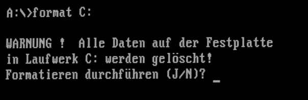 Nachdem du die Eingabetaste gedrückt hast, fragt dich der Manager, ob du dir wirklich sicher bist. Bestätige mit „J“ (für Ja). Damals war es üblich, dass man J/N (oder Y/N für Englisch) eingeben und anschließend nochmals bestätigen musste.