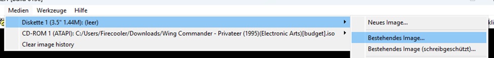 Anleitung für 86Box: Wenn du mit 86Box arbeitest, geht das über das Menü Medien -> Diskette 1 -> Bestehendes Image. Dabei wählst du das Disketten-Image aus (z. B. „msdos_6.22_de_disk1.img“), das du zuvor von einer Internet-Archiv-Webseite heruntergeladen hast. Das geht auch über das Disketten-Icon links unten im Fenster: Wenn du es mit der rechten Maustaste anklickst, öffnet sich das Menü und du kannst so die Diskette auswählen.