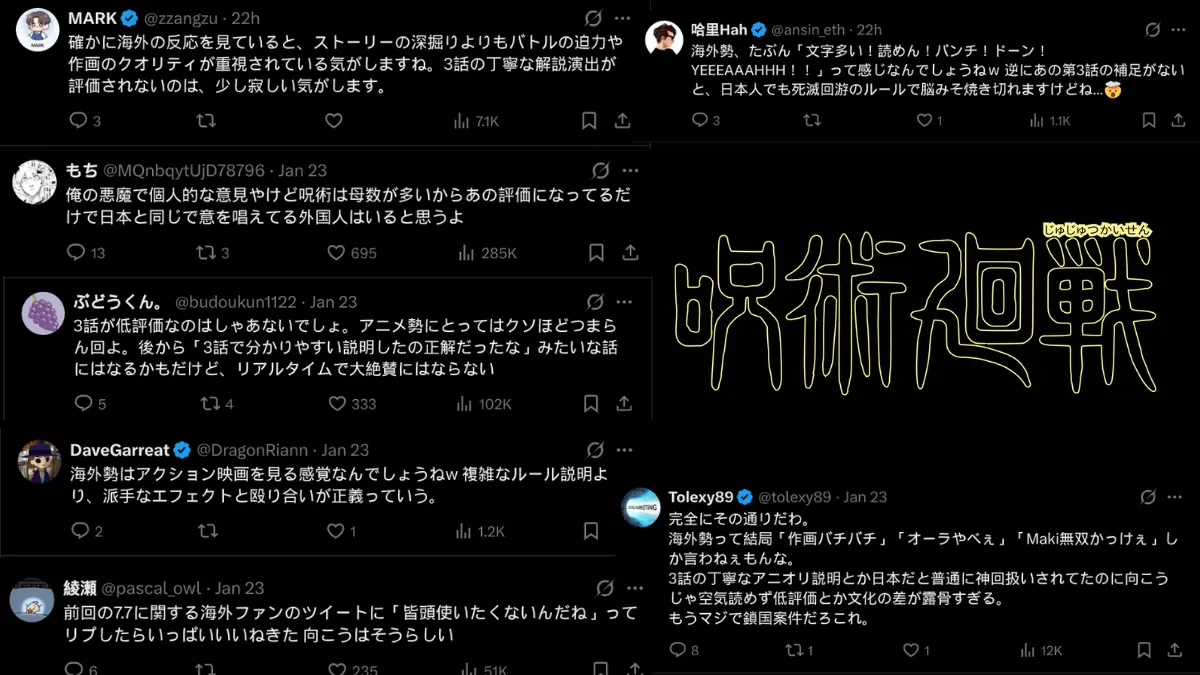 Ein Nutzer auf X (ehemals Twitter) drückte seine Enttäuschung nicht nur über die Episode aus, sondern vor allem über die Reaktion des internationalen Publikums. Während japanische Zuschauer die Anime-Original-Erklärungen zu den Regeln des Culling Game (Auswahlspiel) schätzten, konzentrierten sich ausländische Fans laut dem User fast ausschließlich auf die Action und die Optik.
